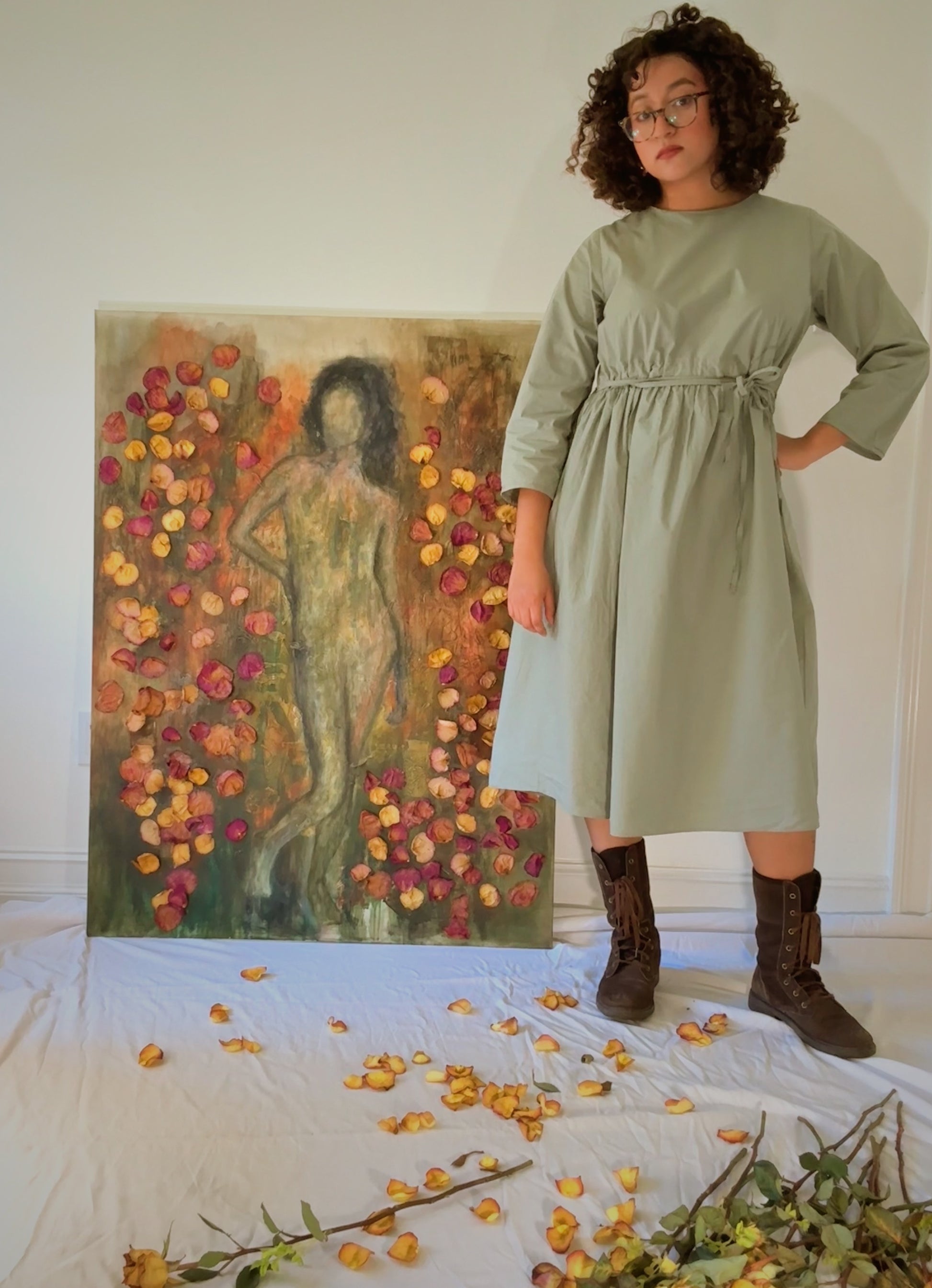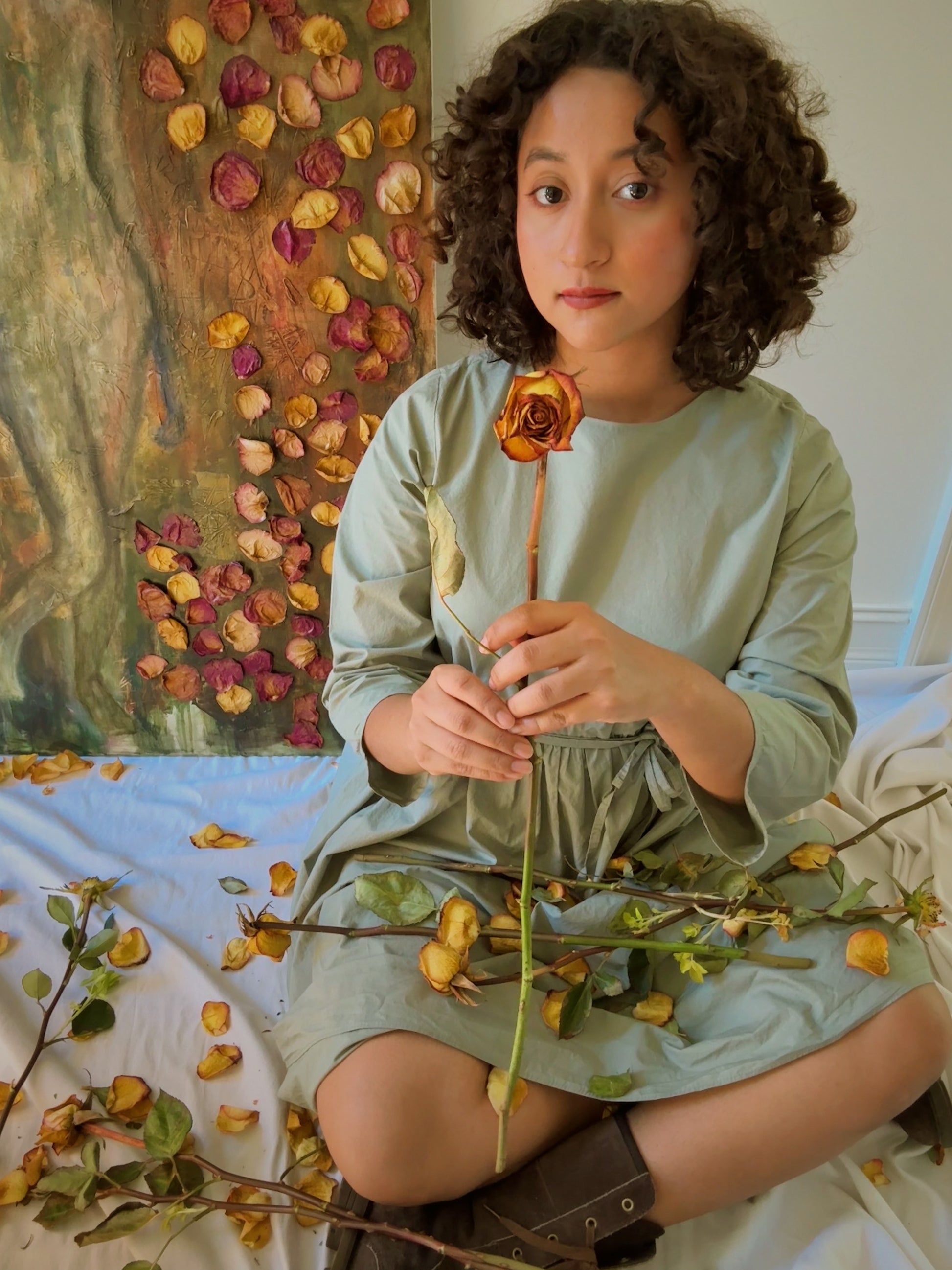 Among dried flowers, she runs with her curls in the air, tousled by the autumn wind.